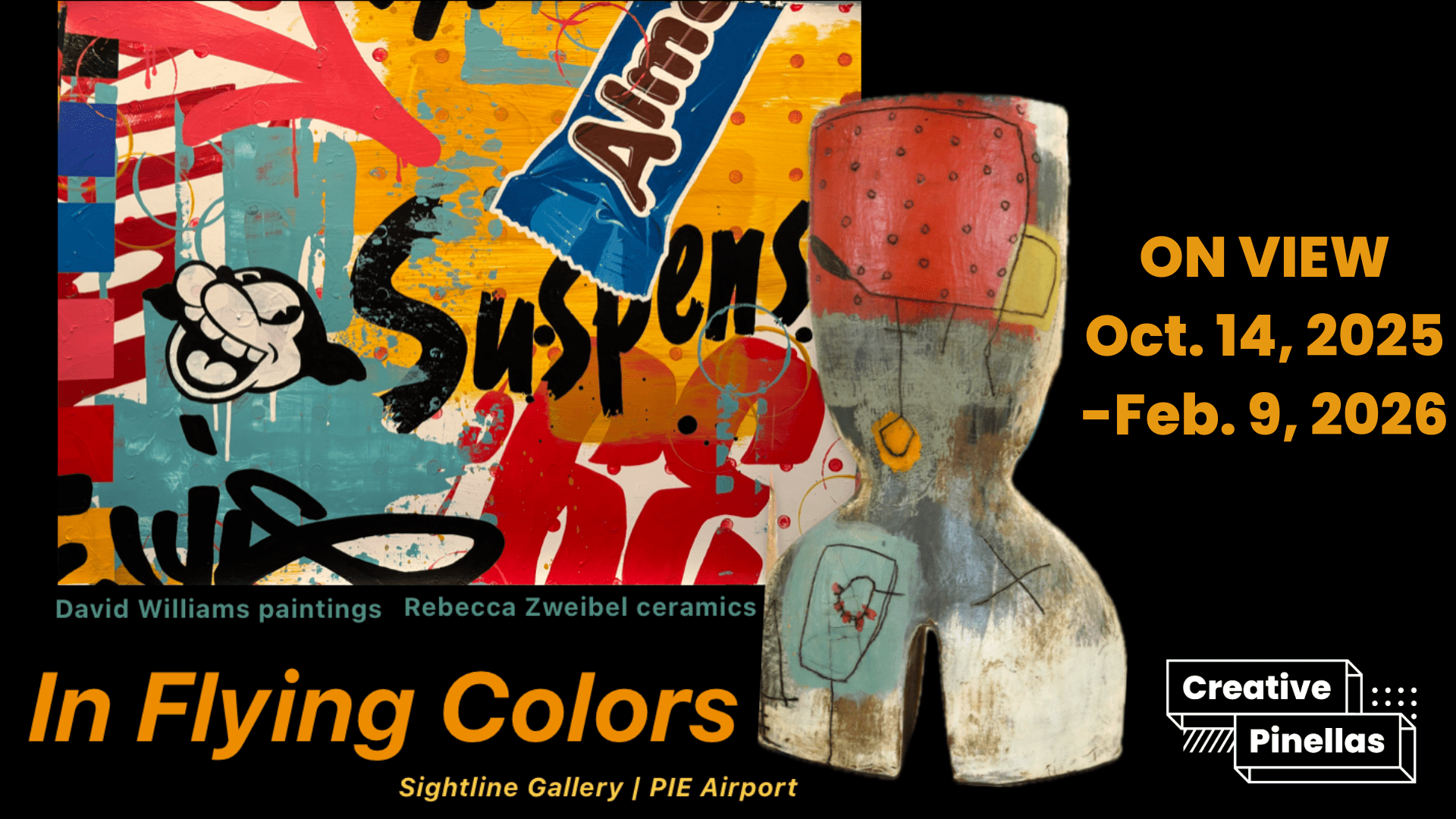 Creative Pinellas, in partnership with St. Pete–Clearwater International Airport (PIE), is proud to launch the second exhibition at the Sightline Gallery, located at PIE. In Flying Colors invites you to experience the vibrant creativity shaping Florida’s Gulf Coast—especially here in  Pinellas County—through artists David Williams and Rebecca Zweibel, whose work captures the region’s color, energy, and ever-evolving artistic spirit.